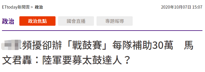 報道稱,台灣“空軍””海軍”近期監偵、戰備任務繁忙,國民黨“立委”馬文君7日爆出,台灣“陸軍”這時候竟然在忙着辦“戰鼓競賽”。她炮轟“陸軍”有錢打鼓缺錢打仗。