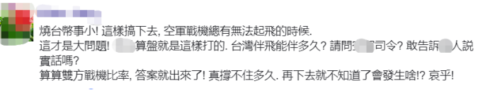 對此,有島內網友留言稱,燒台幣事小,再這樣搞下去, 台“空軍”戰機總有無法起飛的時候,這才是大問題。該網友還説,算算雙方戰機比率, 答案就出來了,台灣真撐不住多久。↓