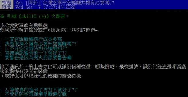 報道稱,該網友在島內網友經常用的論壇PTT上好奇寫下,“台灣空軍不升空就沒辦法和共機通訊嗎?直接通訊警告他一下就好了吧?”一名對軍事有點興趣的男網友回答了他的問題。這名網友説,升空除了通訊外,也可以識別解放軍軍機為何種機種、哪些掛載、飛機編號、識別記錄這是哪區、過來的飛機有沒有新裝備。