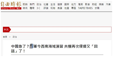 解放軍軍機近期多次現身台灣西南空域,台灣親綠媒體《自由時報》今天(9日)報道稱,台軍今天將在台灣西南方外圍海空域進行實兵“專案操演”,一早解放軍軍機再次進入西南空域。據報道,台空軍對解放軍軍機進行“廣播驅離”時,解放軍軍機再次回話反擊。《自由時報》稱,這是解放軍軍機今年第二度針對台軍廣播“驅離”回話。