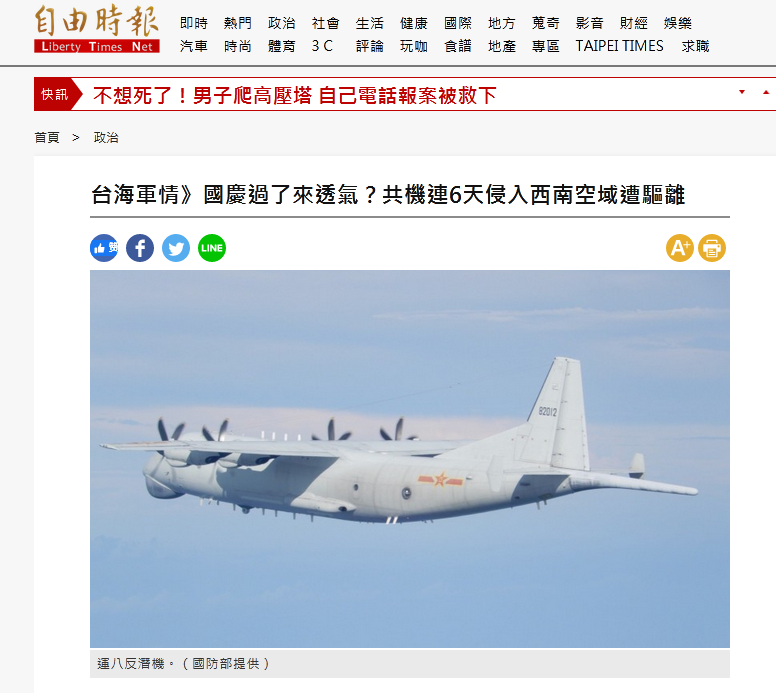 報道稱,台空軍昨日(10日)通過防務部門官網“即時軍事動態”發佈解放軍軍機進入西南防空“識別區”飛航的情況;根據台空軍公佈圖片資料,一架運8反潛機自廣東、福建省交界處的外海飛入台“防空識別區”,隨後以東南向朝“識別區”深處飛行,再依相似路線折返飛回。《自由時報》稱,防務部門於9月16日首度發佈共機動態後,這已是25天來,共機第17度(含今天)“擾台”。