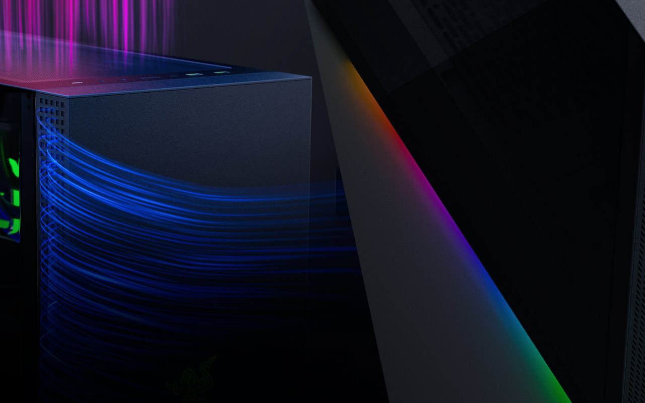 兩款設備都採用 “自殺式鋼化玻璃側板”。這意味着它們的開啓方式就像汽車上的自殺式車門一樣(名字雖然驚險,但其實就是行駛方向前部打開的車門,在沒有安全帶的年代,這種車門的設計造成的致命事故數量要更高。),兩台設備的正面都有RAZERTHS的照明標識,並採用了Razer Chroma Underglow(LED照明)。