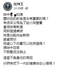 對此,有網友在臉書表示,陳時中知道嬰幼兒的飲食非常重要嗎?有很多父母為了給小孩營養,會用排骨熬湯,用那個湯煮粥,或是加點肉絲熬粥。網友痛批“這麼不負責任的言詞,你們有把下一代的健康放在心裏嗎?”