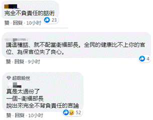有網友回應表示“完全不負責任的話術”,“講這種話、就不配當‘衞福部長’。全民的健康比不上你的官位、為保官位失了良心”“一個‘衞福部長’,説出來完全不揹負責任的言論”。