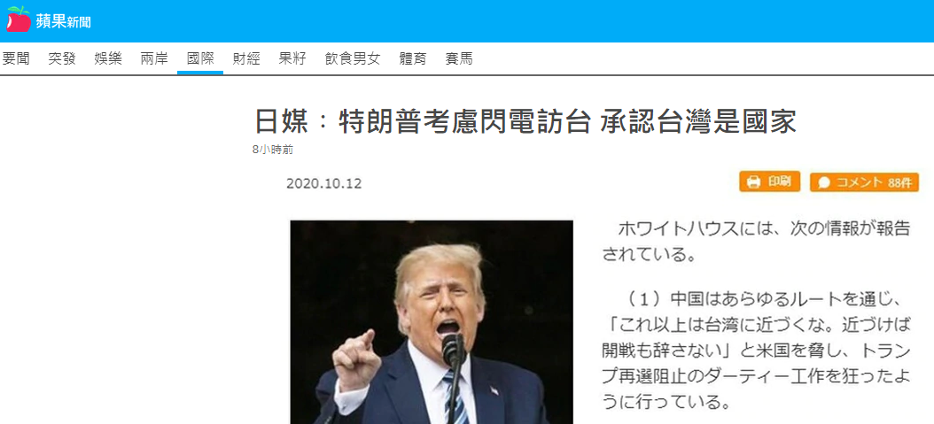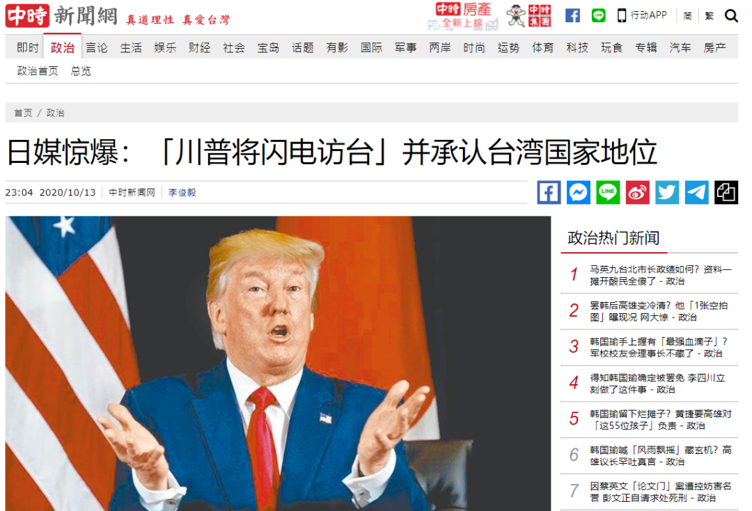 從台灣媒體給出的這家八卦小報的截圖來看,此事其實是《夕刊富士》的一名記者自己腦補出了所謂的特朗普可能會在美國大選前後突訪台灣,以回擊大陸對台施壓的策略。