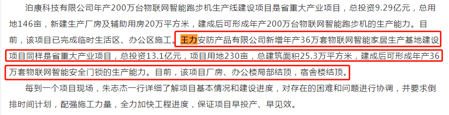 2019年6月,浙江新聞《朱志傑:以高質量項目支撐高質量發展》又報道稱,王力安防產品有限公司新增年產36萬套物聯網智能家居生產基地建設項目同樣是省重大產業項目,總投資13.1億元,項目用地230畝,總建築面積25.3萬平方米,建成後可形成年產36萬套物聯網智能安全門鎖的生產能力。目前,該項目廠房、辦公樓局部結頂,宿舍樓結頂。從該報道看,王力安防“新增年產36萬套物聯網智能家居生產基地建設項目”的總投資是13.1億元,並不是招股書披露的9.68億元。