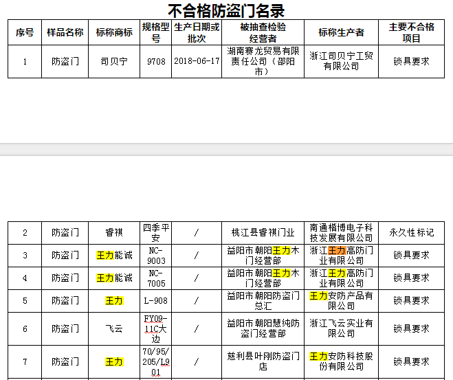 但湖南省市場監督管理局官網發佈的《2018年三季度流通領域商品質量抽查檢驗通報》顯示,王力安防生產的多款防盜門為不合格產品,主要不合格內容為鎖具要求。王力安防是否有意隱瞞產品不合格信息?該批次不合格產品又是如何處理的值得關注。