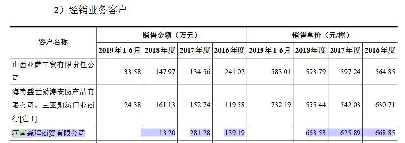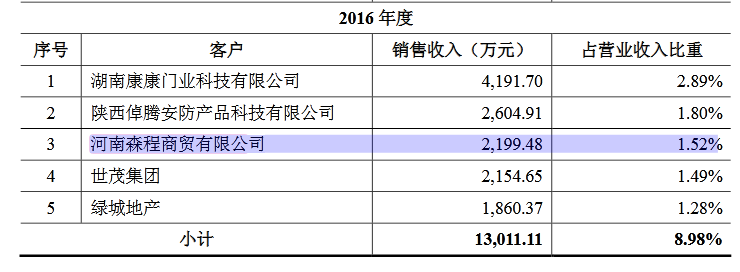 招股説明書顯示,河南森程商貿有限公司是王力安防2016年、2017年的前五大客户,上述年度交易額分別為2199萬和3907萬元。2017年河南森程商貿有限公司還是王力安防第一大客户。