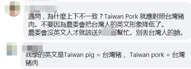 華視新聞網報道稱,對於標章上的英文雖為“TAIWAN PIG”,但中文卻寫“台灣豬”,有網友就提出疑問:“為什麼上下不一致?‘Taiwan Pork’就應對照‘台灣豬肉’。不要因為‘農委會’把台灣人的英文形象降低了。”“為什麼漢字不改成‘台灣豬肉’,這樣對應英文字才對。”↓