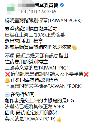 民進黨當局“農委會”在13日在臉書發文稱,創作者當初提交上來的字樣寫的確是“PIG”,但最終已經將其修正為“PORK”,因此最後確定使用的版本英文就是“TAIWAN PORK”。“農委會”還呼籲大家不要再轉傳錯誤訊息。