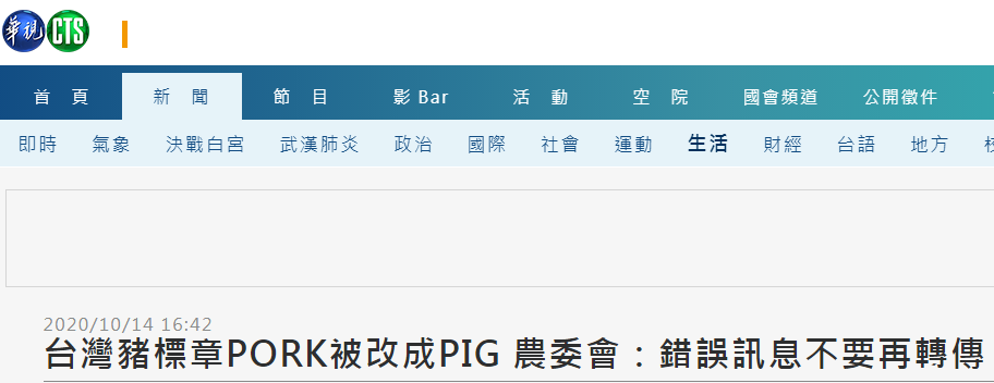 報道稱,不過近日網上傳出“台灣豬識別標章”上的英文竟然是“TAIWAN PIG”的説法,有網友説,這個有辱台灣人的標識居然是台灣衞福部門精選出來的,並更正正確的英文寫法應該是“TAIWAN PORK”,中文寫法則該改為“台灣豬肉”。