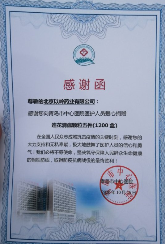 10月15日上午,以嶺藥業向青島市紅十字會捐贈12000盒連花清瘟顆粒,用於青島市六家醫院醫護人員和中風險區居民對新冠肺炎的防控。青島市紅十字會對以嶺藥業的大愛精神給予高度評價。
