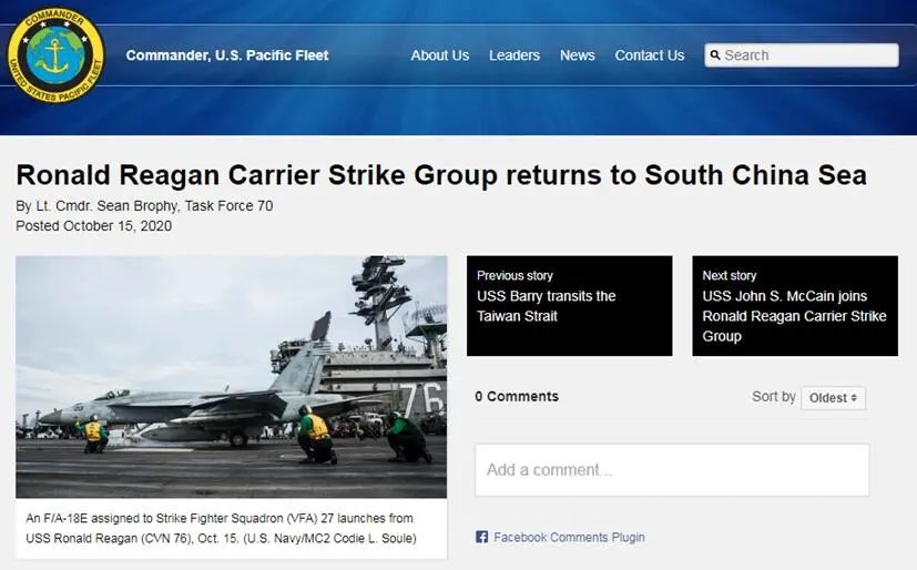 美國太平洋艦隊司令部在其官網上發佈“里根”號航母戰鬥羣駛入南海的消息