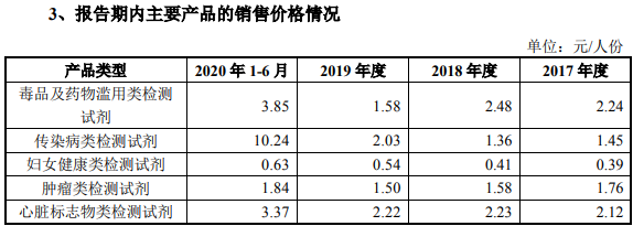 招股書披露,2020年 1-6 月,公司新冠病毒抗體檢測產品銷量 2242.17萬人份,銷售額達37539.13萬元,對主營業務收入貢獻率達77.10%,成為公司2020年上半年度主導產品,為此公司也大幅增加了“傳染病檢測系列”產品產能,增幅達一倍以上。但與此同時,剔除新冠病毒抗體檢測試劑產品銷售收入的情況下,公司2020年1-6月銷售收入金額11148.75萬元,較 2019年同期增加392.68萬元,增幅僅為3.65%。這難免令人擔憂,如果後期對於新冠病毒抗體檢測產品需求減少後,是否會導致公司的產能過剩?