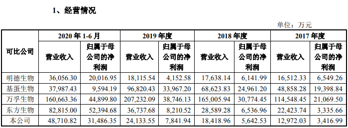 再來看奧泰生物的財務數據,根據招股書披露的“發行人與同行業可比公司的比較情況”,明德生物、東方生物是奧泰生物的同行業可比公司,且三家公司的經營規模較為相近;其中明德生物2019年實現營業額1.81億元,還低於奧泰生物的2.41億元。