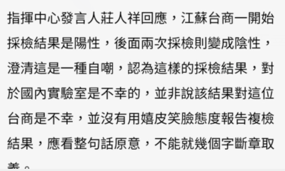 從台灣《聯合報》的報道來看,莊人祥給出的説法是,他的那個“很不幸”指的不是那名台灣居民的陰性檢測結果,而是一種“自嘲”,是在説一開始採檢結果是陽性、後面兩次採檢變成陰性,這樣的結果對於島內檢測實驗室是“很不幸”的。