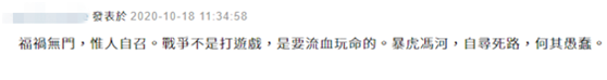 也有人批評稱,“福禍無門,惟人自召。戰爭不是打遊戲,是要流血玩命的。暴虎馮河,自尋死路,何其愚蠢。”