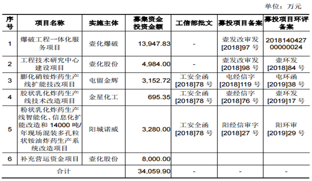 此次壺化股份公開發行5000萬股新股,募集資金主要用於爆破工程一體化服務等5個項目,合計募資3.4億元左右。本次發行募集資金扣除發行費用後將用於以下項目: