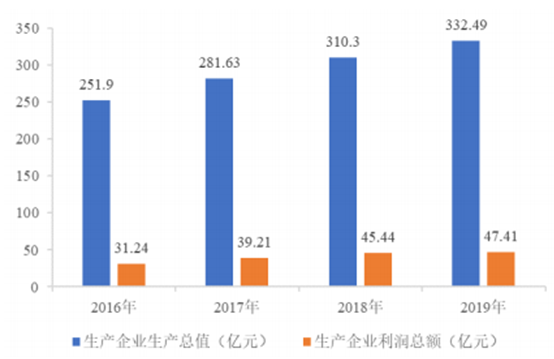 數據顯示,2017-2019年,國內民爆行業生產企業分別實現生產總值281.63億元、310.30 億元、332.49億元,年均複合增長率10.01%,預計未來三年,年均複合增長率將達到6.9%以上。下圖3:2016年至2019年民爆行業生產企業生產總值和利潤情況