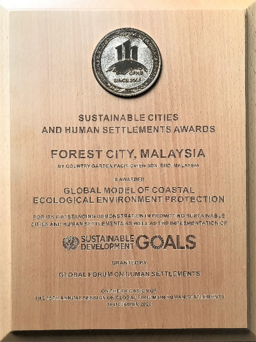 10月16日,聯合國“城市十月”紀念活動——第十五屆全球人居環境論壇年會(GFHS 2020)於10月15至16日採用線上線下結合形式舉行,主題為“疫後復甦與蝶變:彈性城市,健康星球”。全球人居環境論壇主席、聯合國前副秘書長暨高級代表安瓦爾·喬杜裏大使發表開幕致辭。2020可持續城市與人居環境獎頒獎盛典(SCAHSA·颯颯獎)作為本屆年會的一大亮點,於10月16日晚上隆重揭幕。位於馬來西亞柔佛州的森林城市憑藉出色的城市綠色生態系統建設與發展,用環保理念貫穿城市規劃、開發建設和城市運營,榮獲“2020年可持續城市與人居環境獎(SCAHSA·颯颯獎)濱海生態環境保護範例獎”。