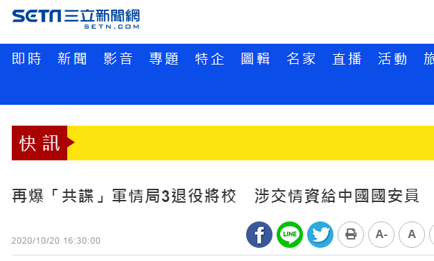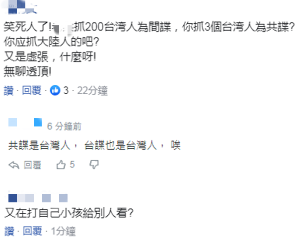 在大陸日前宣佈逮捕200多名“台諜”後,據台灣親綠媒體“三立新聞網”10月20日報道,台方檢調今日(20日)宣稱破獲一起“共諜案”,稱台“軍情局”3名退役將校,涉嫌交情報給大陸國安人員,今日被傳喚到案。 針對此事,有島內網民諷刺,“無聊透頂”,“又在打自己小孩給別人看?”