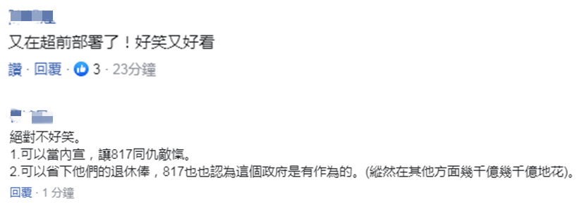 也有網友稱,“又在超前部署了!好笑又好看。”隨即有人調侃,民進黨當局此舉可以當內宣,讓817 (投票給蔡英文的選民)同仇亂愾 。