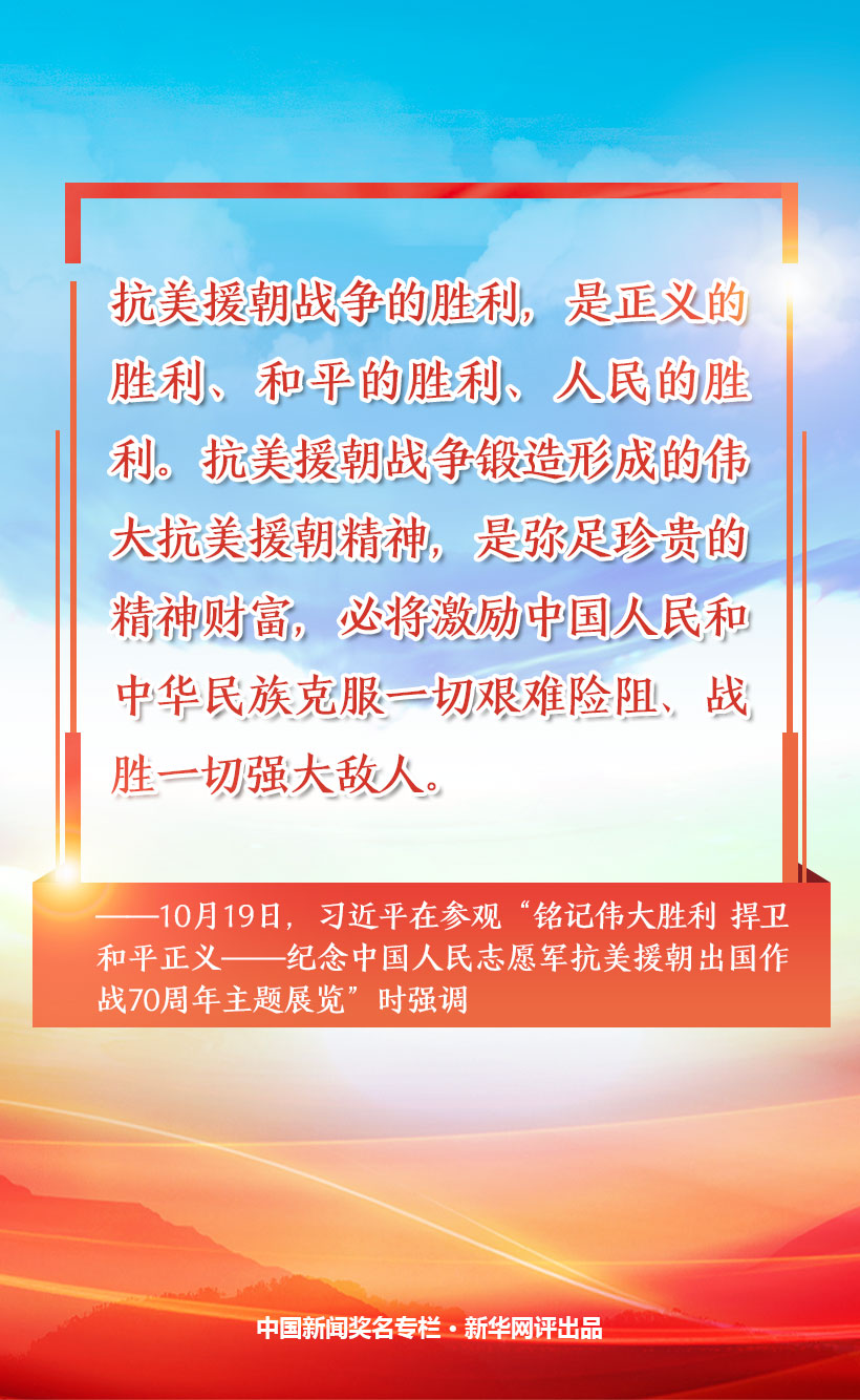 偉大事業需要偉大精神,偉大精神成就偉大夢想。偉大的抗美援朝精神永遠是中國人民的寶貴財富。抗美援朝戰爭的勝利告訴我們,愛國主義是凝聚全民族力量的旗幟,革命英雄主義是我們克敵制勝的法寶。緬懷英雄們的赤子丹心,傳承偉大的抗美援朝精神,牢記初心使命,堅定必勝信念,發揚鬥爭精神,增強鬥爭本領,我們必將凝聚起奮進復興之路的磅礴偉力,把祖國保護得更加安全,建設得更加美好。(文字:馬若虎 海報:程媛媛)