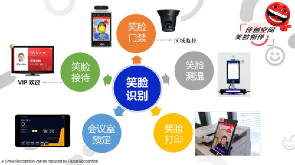 “佳創空間”是由佳能(中國)旗下的佳能創新科技(北京)有限公司獨立本土化研發的智能IT解決方案。該方案包含5大可選功能模塊,分別為笑臉門禁和考勤、笑臉測温、笑臉會議室預約管理、笑臉訪客登記、笑臉打印,構建了高度定製化的智能化空間管理體系,適用於各類規模的企業、政務大廳、醫院、學校、銀行等機構,以及餐廳等商業服務場所。此外,基於“感動常在”的企業文化,佳能始終提倡“大笑”、“大健康”的理念,在後疫情時代更希望能夠帶給大家歡樂和健康。因此,在“佳創空間”智能IT解決方案中特別融入了笑臉識別的全新體驗,希望能夠用笑容讓大家放鬆身心,獲得健康,從而營造更加愉快的工作氛圍,提升效率。