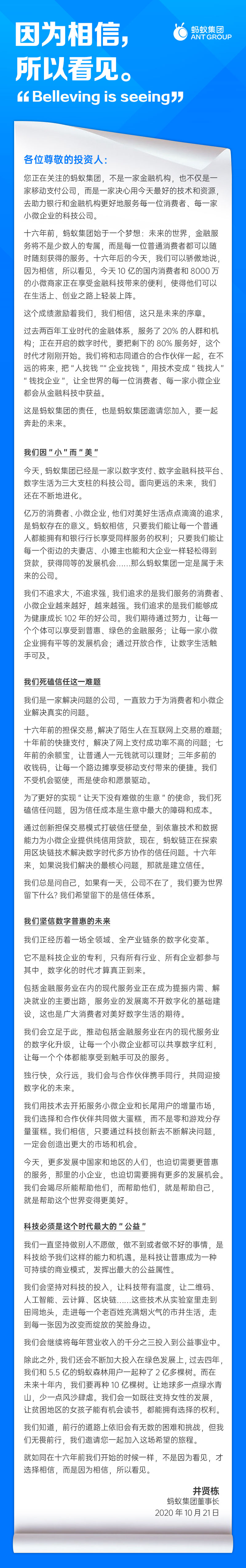 以下是螞蟻集團董事長井賢棟致投資者信全文: