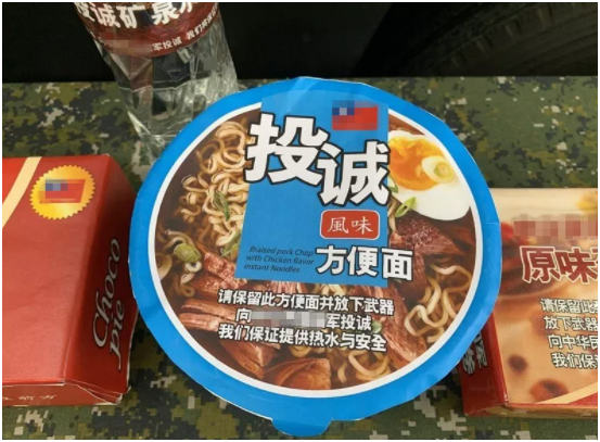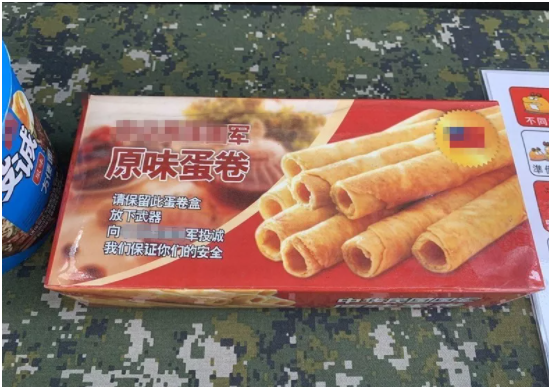 此前,台防務部門發明了新的“奇葩戰術”——大推印有“心戰文宣”內容的“投誠食品”。據報道,這些“心戰食品”包括蛋卷、餅乾、泡麪、牛奶糖、礦泉水等,加印簡體字文宣後變身“投誠方便麪”、“投誠蛋卷”、“投誠牛奶糖”、“投誠礦泉水”。包裝盒上還印了最近投降地點的位置圖,地點隨部隊駐地不同而改變。