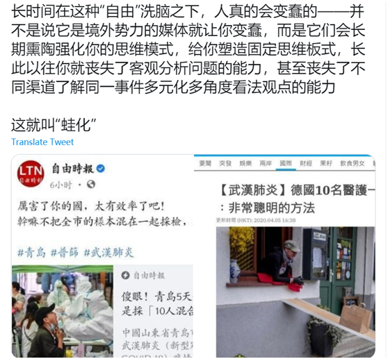 對此,該網友表示:“長時間在這種‘自由’洗腦之下,人真的會變蠢的——並不是説它是境外勢力的媒體就讓你變蠢,而是它們會長期薰陶強化你的思維模式,給你塑造固定思維板式,長此以往你就喪失了客觀分析問題的能力,甚至喪失了不同渠道瞭解同一事件多元化多角度看法觀點的能力。”
