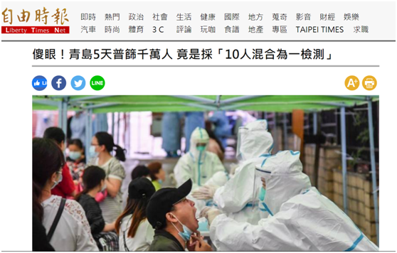 在這篇發表於本月20日的文章中,《自由時報》以誇張的標題寫道:“傻眼!青島5天普篩千萬人竟是採‘10人混合為一檢測’”,並援引台灣“衞福部長”陳時中日前談及此事的表態諷刺道:“真是太偉大了,但怎麼可能?”該文文末還引用台灣網友的話稱:“問題很大好嗎,這做法更吃試劑靈敏度”“如果有人剛中,病毒量不高,再稀釋10倍,驗得到?”