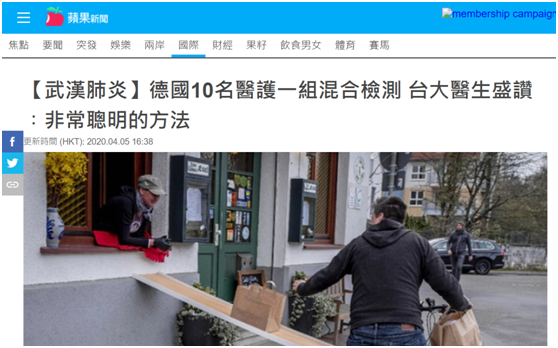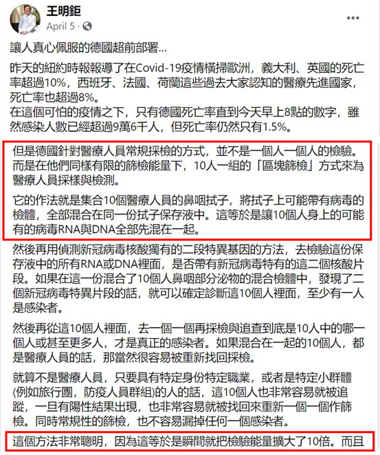 然而,互聯網是有記憶的。今年4月5日,台灣名醫、台大醫院前副院長王明鉅在其臉書頁面上盛讚德國在抗擊疫情上的“超前部署”,其中特別提到,“德國針對醫療人員常規採檢的方式,並不是一個人一個人的檢驗。而是在他們同樣有限的篩檢能量下,10人一組的‘區塊篩檢’方式來為醫療人員採樣與檢測。”王明鉅誇讚道,“這個方法非常聰明,因為這等於是瞬間就把檢驗能量擴大了10倍。”