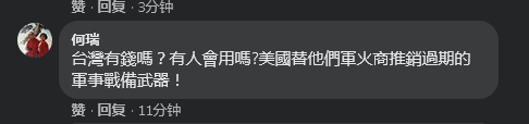 也有人質疑美國售台武器都是過時的,“台灣有錢嗎?有人會用嗎?美國替他們軍火商推銷過期的軍事戰備武器!”“買來當古董?”