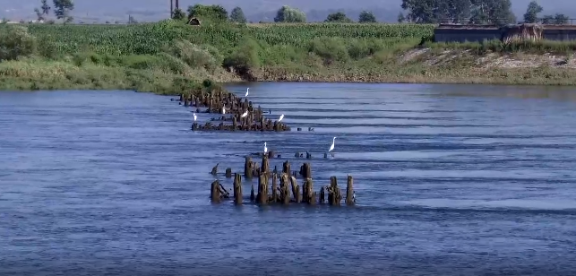 伴着靜靜流淌的鴨綠江,一排黑褐色的木樁格外醒目,這便是丹東鴨綠江燕窩鐵路橋遺址(鴨綠江浮橋)。豐水季節沒在水裏,枯水季節橫江矗立。雖然經歷了七十年的風雨,但它依然穩立江中,默默地帶領人們走進了硝煙瀰漫的歷史,向後人講述着不能忘卻的勝利。
