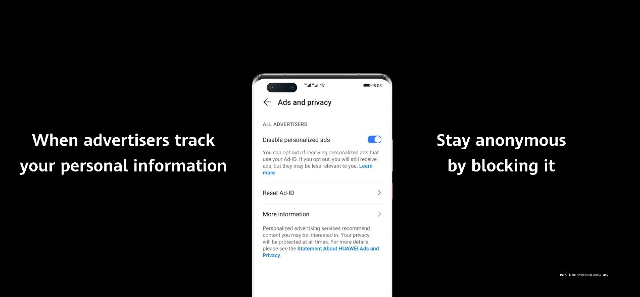 為方便用户管理自己手機上的定向廣告,華為提供廣告跟蹤開關,用户打開“限制廣告跟蹤”開關後就能阻止定向廣告的投放;用户選擇“重置廣告標識符”就能阻止廣告商對個人數據的持續跟蹤。