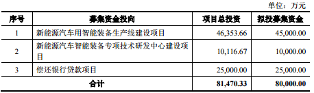 招股書顯示,此次豪森股份擬募集資金8億元,其中4.5億元用於“新能源汽車用智能裝備生產線建設項目”,1億元用於“新能源汽車智能裝備專項技術研發中心建設項目”,如下圖1: