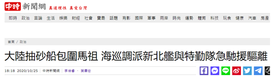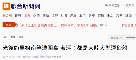 【環球網報道 記者趙友平】今天(25日)是台灣光復75週年,台媒炒作今日一早馬祖南竿海面出現大批大陸抽砂船,仿若“圍島”,台灣“海巡署”為此派出新北艦與特勤隊急馳援“驅離”。不過,馬祖海巡隊隨後澄清稱,這些抽砂船隻是在線外水域經過。