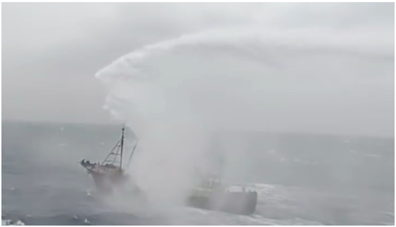 前天(10月23日),有20餘艘大陸漁船出現在澎湖西吉海域避風,台灣“海巡署”派出3000噸高雄艦前往,以發射水炮方式驅離大陸漁船至澎湖限制水域外。↓
