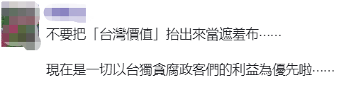 還有網友勸蘇貞昌不要把“台灣價值”抬出來當遮羞布,因為現在一切都是以“台獨”貪腐政客們的利益為優先。↓