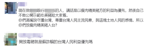 對此,島內網友諷刺蘇貞昌:現在做“行政院長”的人,講話是以瘦肉精美豬方的利益為優先,然後自己不敢公開示範吃美豬給大家看。↓