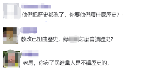對於馬英九批評民進黨,有島內網友留言稱,“他們把歷史都改了,你要他們讀什麼歷史?”↓