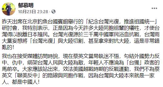 鬱慕明23日還在臉書發文稱他日前出席在北京釣魚台國賓館舉行的“紀念台灣光復,推進祖國統一”研討會。他認為,正是因為今天許多大陸同胞祖輩的犧牲,才使台灣得以脱離日本殖民。台灣光復源於3000萬中國軍民浴血抗戰,台灣兩大黨妄想將“台灣光復”與大陸切割,甚至拿來對抗大陸,這是非常錯亂的。
