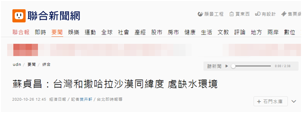蘇貞昌隨後還給出了一番解釋:其實台灣是處在一個缺水的環境裏,因為和台灣同樣緯度的地方,在非洲是撒哈拉沙漠,在阿拉伯半島是阿拉伯沙漠,所以台灣應該是缺水的,但老天爺對台灣非常好。