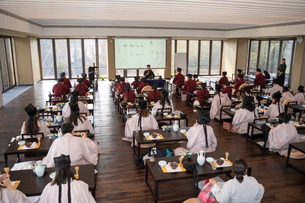 在竹茶書院的特色國學體驗課上,媒體團換上了宋代儒生的服裝,沿襲古人的食、住、坐、卧禮儀,朗誦經典。與香道老師敍香會,打香篆,品香茗,凝神清雅、放鬆身心。360度環繞觀影的“盒子影院”,還帶他們瞭解了徑山和徑山竹茶書院的文脈歷史。