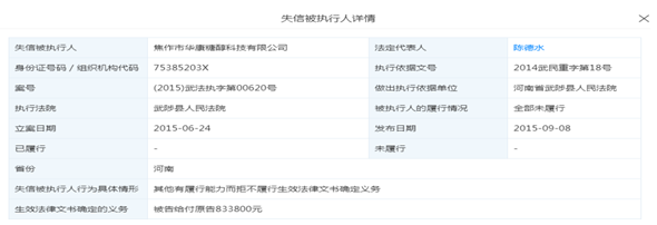 公開資料還顯示,焦作華康因拒不履行武陟縣人民法院2014武民重字第18號判決生被列為失信人。而對此,華康製藥稱,該事項發生在2015年,金額較小,僅為83.38萬元,該案件歷經一審、發回重審及二審終審,其後焦作華康又對該案進行了申訴,期間未及時履行判決,因此於2015年被短暫列入失信被行人名單。焦作華康後已履行判決,相關負面影響已於2016年消除。
