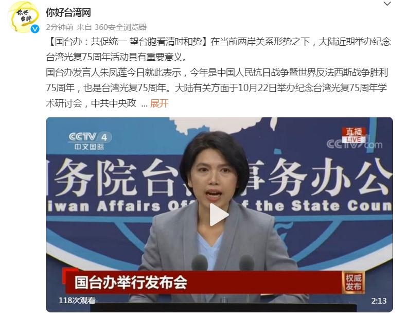 國台辦發言人朱鳳蓮今日就此表示,今年是中國人民抗日戰爭暨世界反法西斯戰爭勝利75週年,也是台灣光復75週年。大陸有關方面於10月22日舉辦紀念台灣光復75週年學術研討會,中共中央政治局常委、全國政協主席汪洋出席並發表重要講話。兩岸同胞共100餘人出席了研討會,圍繞“紀念台灣光復、推進祖國統一”的主題深入研討。10月25日,“金甌無缺——紀念台灣光復75週年主題展”在中國國家博物館開幕。