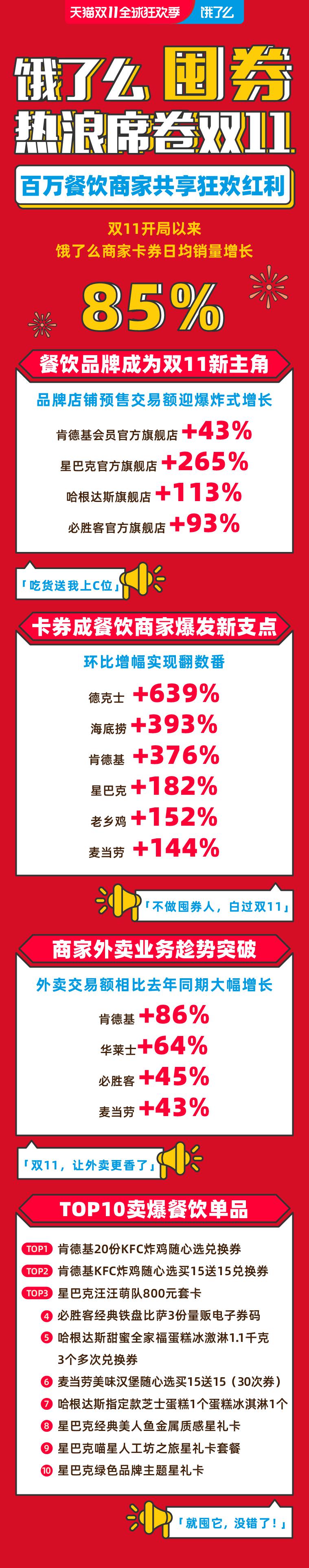 據餓了麼統計:僅在雙11首周,商家卡券日均銷量就實現超八成的增長,部分商家卡券銷售增幅更是實現較日常翻了數番。以連鎖品牌為例,德克士在首周卡券銷售增幅達639%,海底撈和肯德基的卡券銷售增幅達分別達393%和376%,星巴克、老鄉雞、麥當勞的卡券銷售增幅都實現了翻倍增長。
