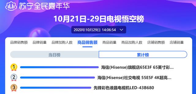 如今的"雙十一"早已不是線上的"獨角戲",而全渠道的消費狂歡。29日,蘇寧易購發佈的最新悟空榜顯示:28日、29日,海信電視在全渠道的銷售額、銷售量數據均名列前茅,持續引領"雙十一"線上線下的電視消費。