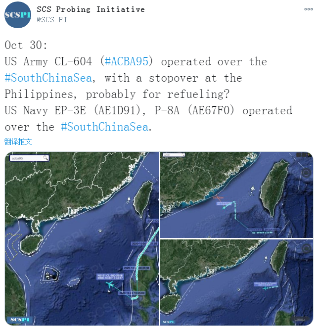 據“南海戰略態勢感知”計劃平台10月30日發佈的消息,當天上午,美軍向南海同時出動了3架偵察機,其中包括一架美國陸軍的CL-604偵察機和一架美國海軍的EP-3E電子偵察機、一架美國海軍P-8A反潛巡邏機。